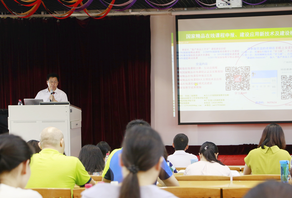 国家级教学名师蒋爱民教授作了“国家精品在线课程申报、建设应用新技术及建设模式”的专题报告。蒋爱民主要从首批国家精品在线课程认证及发展规划、国家精品在线课程申报及完善、国家精品在线课程新技术支撑及应用、精品在线课程建设模式及建议等方面作了介绍,并以其主持的国家精品在线开放课程“畜产食品工艺学”的建设历程及教学应用为例,分享了线上线下相结合教学模式的实施及应用经验,着重分析了混合式教学模式、基于移动教学平台的课程建设与教学应用,在转变课程教学方式、提高学生学习效果和提升课程教学质量的重要支撑作用。