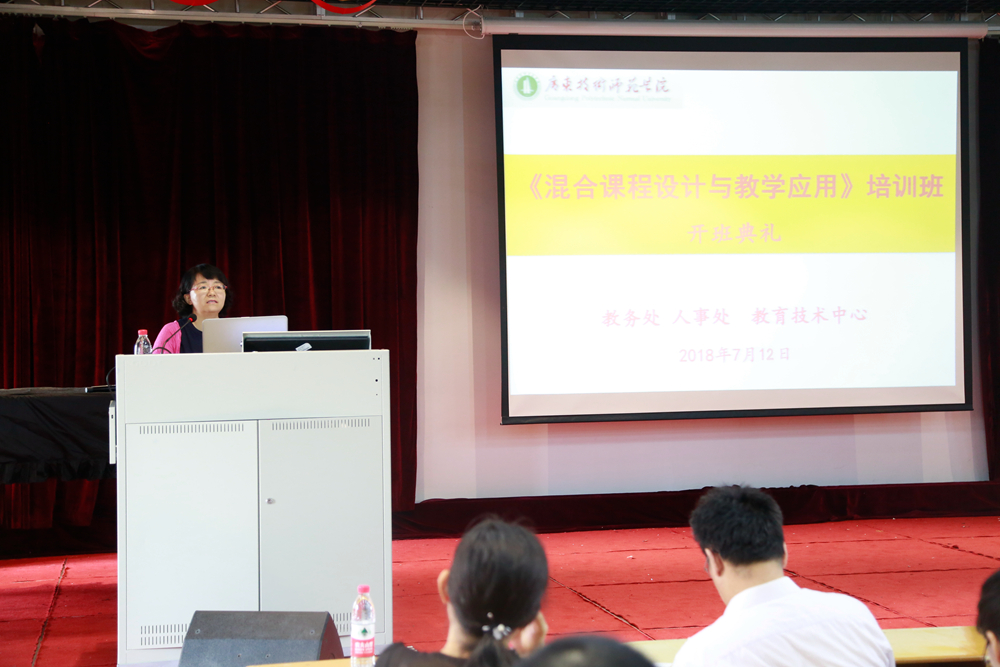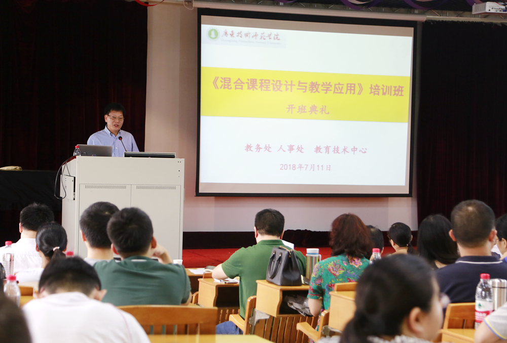 为深入贯彻落实新时代全国高等学校本科教育工作会议精神,加快我院混合式教学模式改革和在线开放课程建设,7月11日—12日,学院举办两期“混合课程设计与教学应用”培训班,华南农业大学蒋爱民教授、中山大学王竹立教授、广东工业大学周密副教授、惠州学院徐宁副教授及超星集团技术专家等分别应邀作专题讲座。学院党委书记凌靖波、副院长许玲分别出席两期开班仪式并讲话。来自20个教学单位的主管教学的副院长、骨干教师共计340余名教师参加培训。两期培训班分别由教务处副处长向凯、教育科学与技术学院副院长吴天生主持。