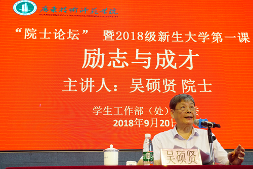 9月20日下午,我院“院士论坛”暨2018级新生大学第一课在白云校区学生活动中心举行。中国科学院院士、华南理工大学建筑学院吴硕贤教授应邀为2018级新生做了题为《励志与成才》的专题报告。学院副院长戴青云出席并主持报告会,团委、学生处负责同志以及白云校区部分老师、2018级新生参加了报告会。