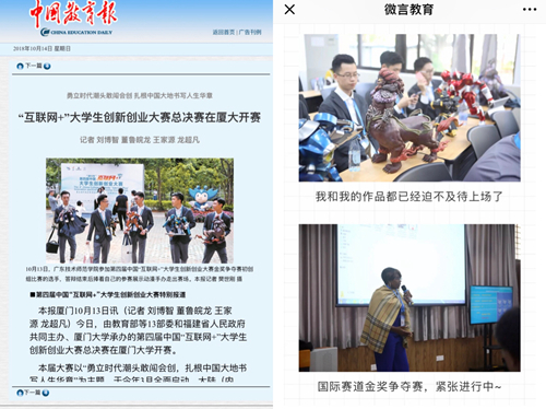 经组委会遴选,在比赛期间,我院参赛学生自主设计,并注册原创IP的动漫作品在大赛大学生创客秀展厅展出,栩栩如生的动漫作品吸引了来自全国参赛高校师生的围观和交流,展览期间,还吸引众多企业家、风险投资者前来洽谈合作。中国教育报、教育部官微“微言教育”等媒体纷纷报道我院参赛学生的项目,充分展现了我院学子全面发展、勇于创新创新的良好精神风貌。