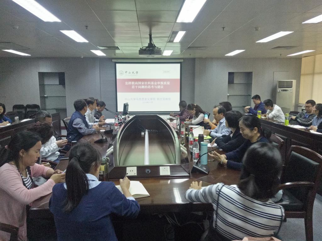 11月1日下午,为进一步提升我院教师科研水平与申报课题质量,学院邀请中山大学博士生导师郭文亮教授于工业中心605就《怎样提高国家社科基金申报质量若干问题的思考与建议》展开专题辅导讲座。科研处、马克思主义学院负责人及部分二级学院师生聆听讲座。