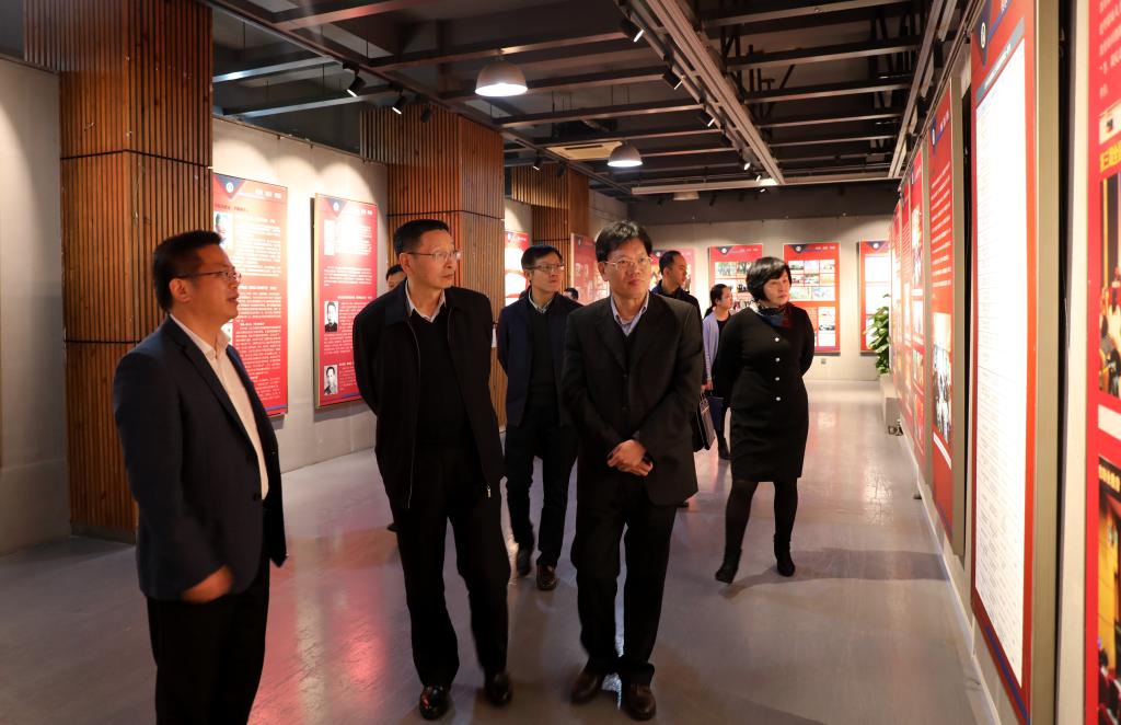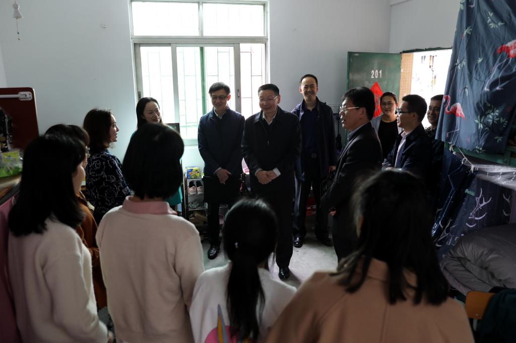 薛继海一行人在凌靖波、贺勇的陪同下参观了伟德官网校史展和“非遗传承大师工坊”,还深入学生宿舍走访看望学生。(学生处)