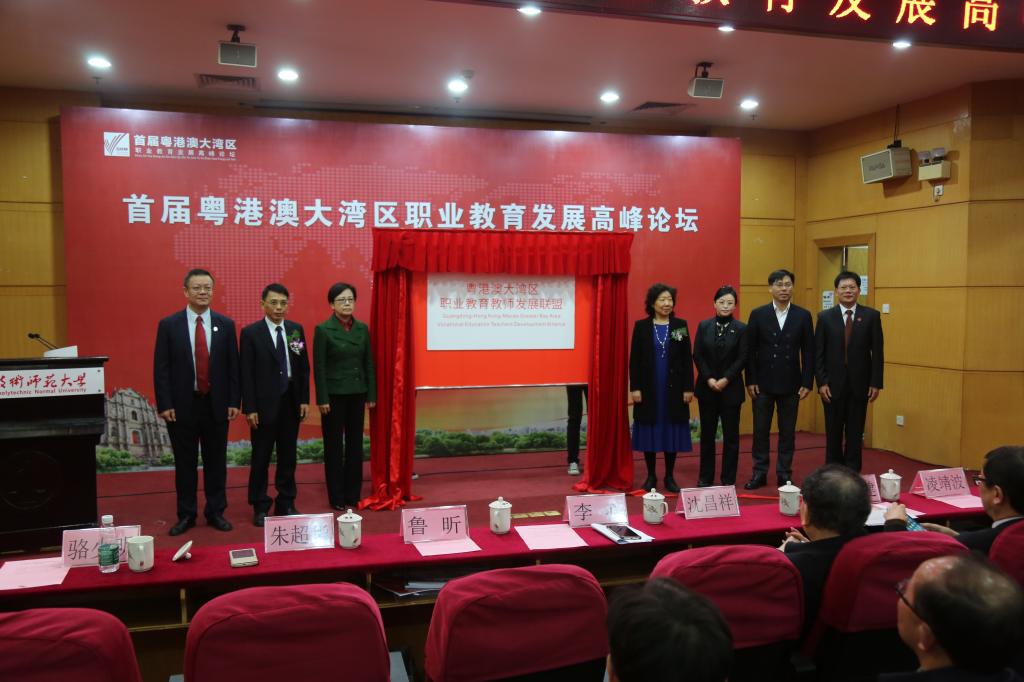 论坛开幕式上,李心、鲁昕、朱超华、凌靖波、骆少明、李子建(香港教育大学副校长)、张沁(香港可持续发展教育学院院长)共同为刚成立的“粤港澳大湾区职业教育教师发展联盟”牌匾揭牌。