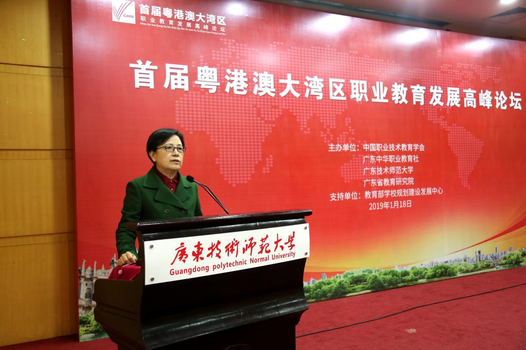 广东省政协副主席、民建广东省委主委、广东省中华职教社主任李心代表广东中华职教社对高峰论坛的成功举办表示热烈的祝贺,李心指出,职业教育融合发展、共建共享是未来大湾区职业教育发展的共同愿景,有了这个思想基础,才能统筹粤港澳三地职业教育各方的分工协作与有效合作,才能更好实现粤港澳大湾区职业教育与区域经济的协调发展。