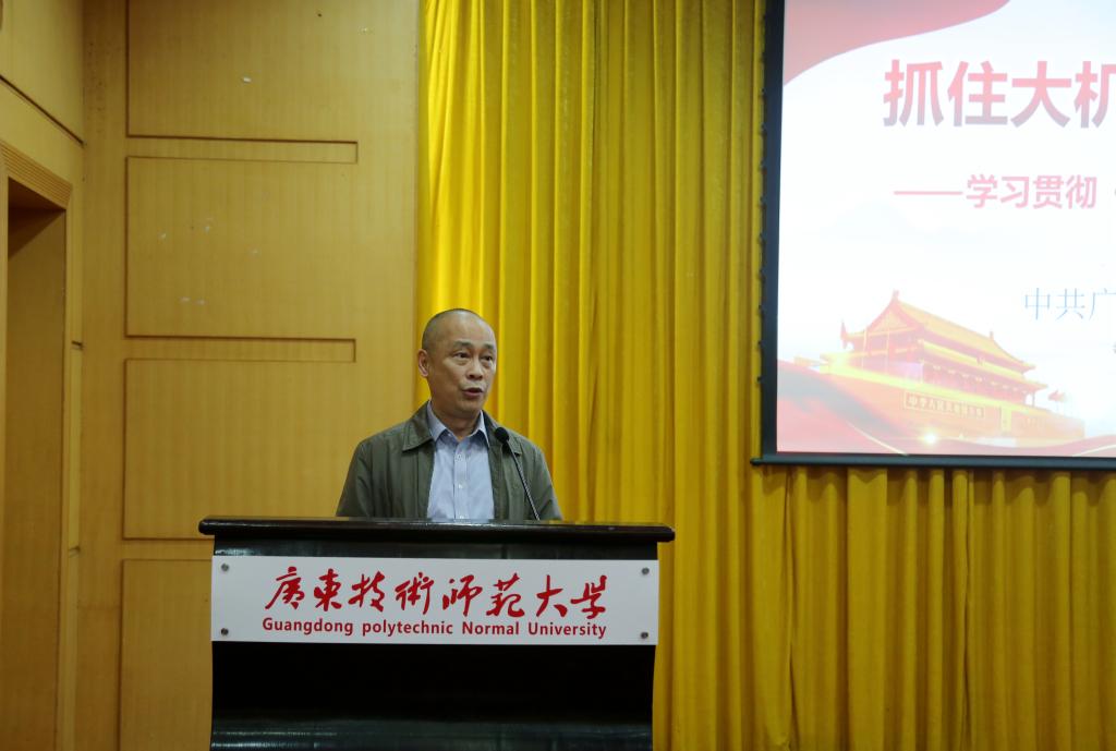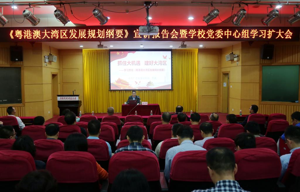 3月20日下午,《粤港澳大湾区发展规划纲要》宣讲报告会暨中心组学习扩大会在校本部208学术报告厅举行,学校邀请省委宣讲团成员、省委宣传部讲师团团长李斌同志到校作宣讲报告。学校党政领导,全体中层干部,各民主党派负责人,马克思主义学院教师和学生代表参加报告会。报告会由副校长潘自勉主持。
