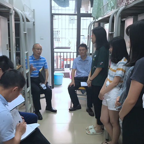 5月24日上午,学校副校长潘自勉到白云校区调研学生宿舍搬迁工作,走访白云校区3栋宿舍楼,了解学生思想情、学习和生活情况,并就北校区基本情况、生活配套、教学环境、宿舍环境、搬迁安排等焦点问题与同学们进行互动交流。