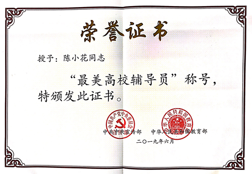 为切实引领青年开拓创新、奋发有为,中宣部、教育部首次从历届在岗的“高校辅导员年度人物”和在读的“大学生年度人物”中,遴选出10名“最美高校辅导员”和10名“最美大学生”候选人,并于5月31日—6月6日进行公示。公示结束后,中宣部、教育部于6月11日在中央广播电视总台举行2019年“最美高校辅导员”和“最美大学生”发布仪式,在一分钟的获选感言中,陈小花老师讲述了自己16年来坚守辅导员岗位,“躬耕一线育繁花”的心路历程和感悟。