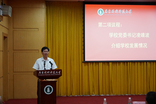 凌靖波向代表们介绍了学校办学规模、师资力量、科研水平、社会影响力和发展机遇,表示学校将进一步强特色、调结构、抢人才、补短板、深改革、强党建,努力创建国内一流、特色鲜明的高水平技术师范大学。希望校友们多为学校出谋献策、扬名宣传、用心用力;希望学校各级校友会(地方校友联络处)认真做好校友工作,共同促进学校的发展。