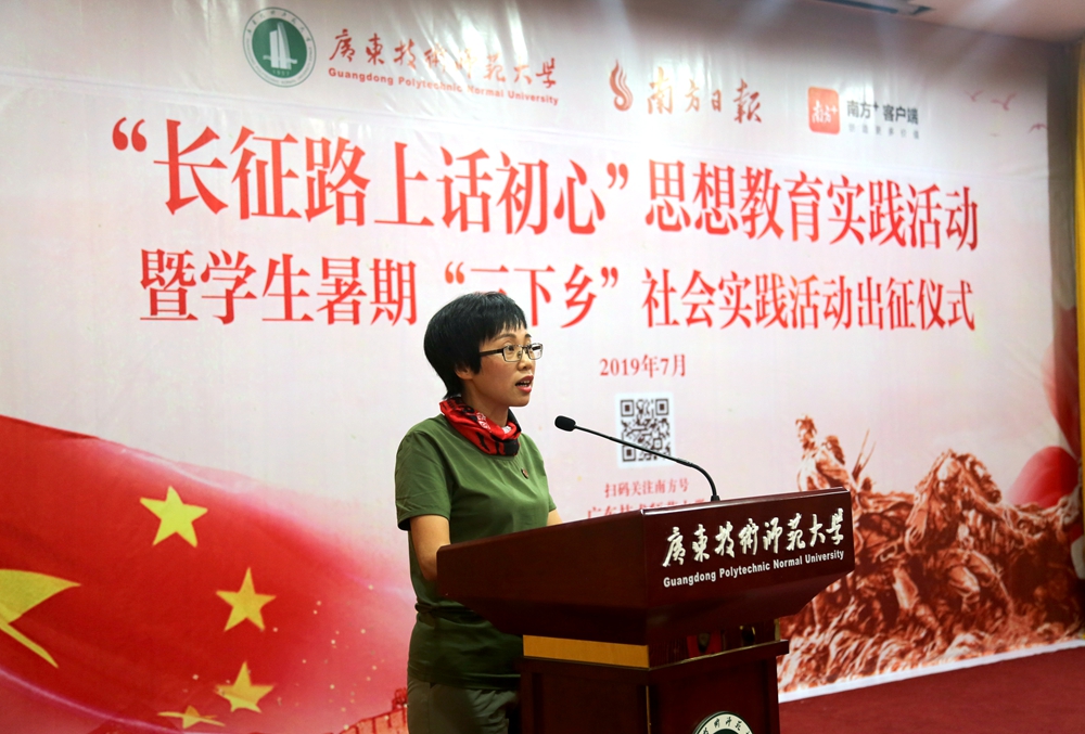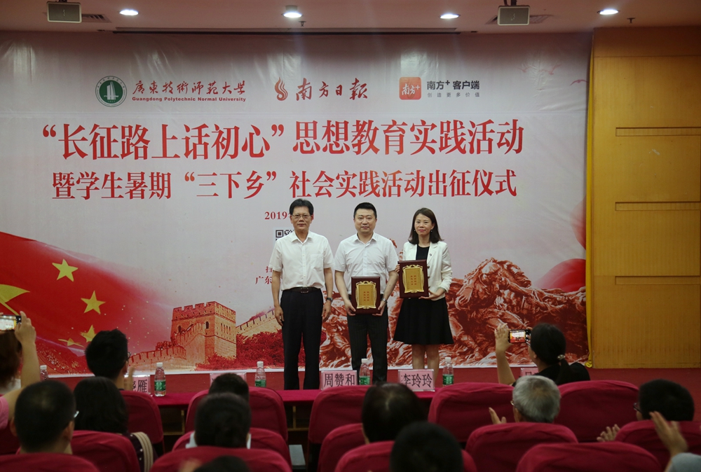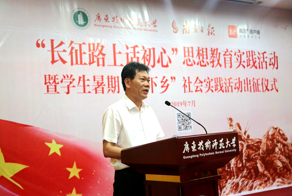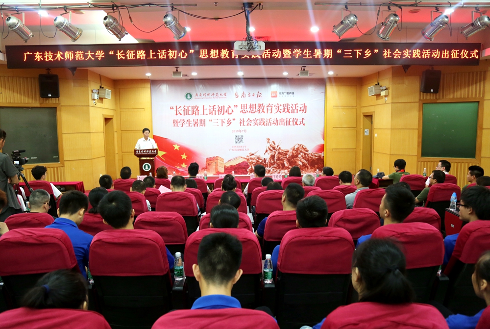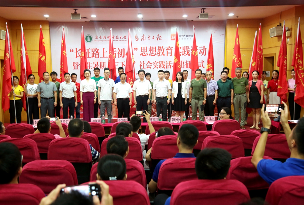 7月11日下午,实践活动出征仪式在校本部举行。学校党委书记凌靖波,广东省青年企业家协会副会长、和宇健康科技股份有限公司董事长周赞和,广东省青年企业家协会秘书长、时代中国控股有限公司党委书记李玲玲,广东省时代公益基金会副秘书长吴玮琪,南方+客户端南方号运营中心运营主管吕晓雁等领导嘉宾,南方日报、羊城晚报、广州日报,南方都市报、新快报、信息时报、广州电视台等媒体朋友出席了会议。学校相关职能部门负责人和实践团队师生代表200多人参加了会议,仪式由学校党委副书记李向明主持。