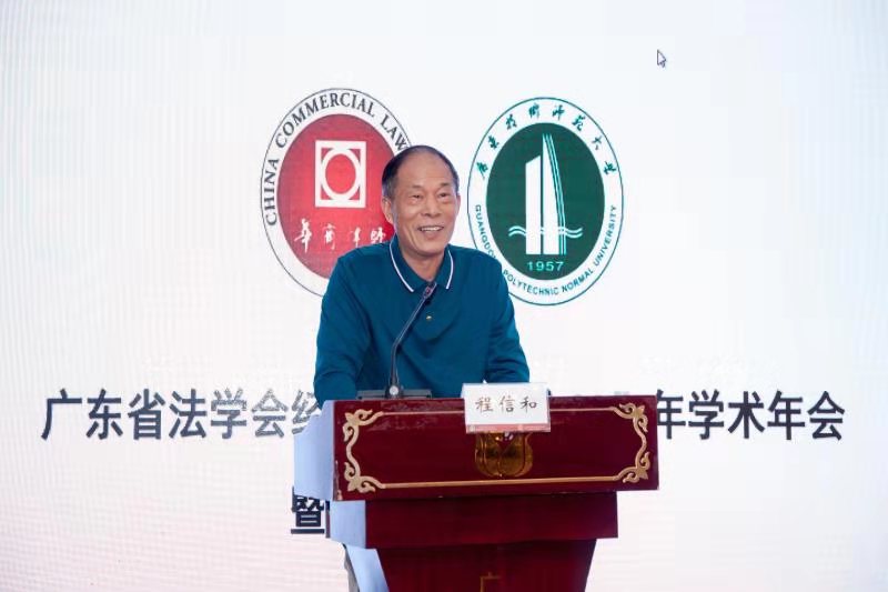 “专题研讨”由华南理工大学法学院刘国臻教授主持。中山大学法学院教授、中国法学会经济法学研究会顾问程信和作了题为《<经济法通则>框架结构的逻辑进路》的精彩讲话。《经济法通则》的基本定位是国民经济运行在合理区间的支撑之柱、国民经济领域的基本之法、各种经济法律规范的领头之纲。“总则”规定“通用规则”,表述为宗旨、原则、主体、权利、行为、责任6个要点。“分则”规定“系列制度”,拟设五个板块,表述市场机制、发展规划、财政税收、货币金融、产业发展、区域协调发展、消费、投资、对外开放和经济监督等10大类法律制度。“附则”规定“相关事项”,应为经济公益诉讼留下发展空间。最后,倡议经济法学广东团队凝心聚力、守正创新,为大力推进《经济法通则》而奋斗。