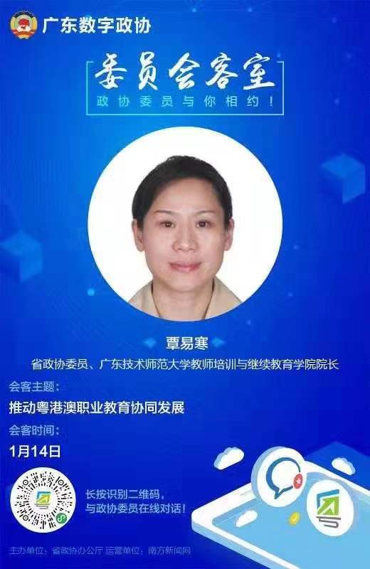 在省政协服务专区的数字“委员会客室”中,省政协在大会期间每天安排2名委员共10名委员值班,回答各路网友的提问,覃易寒是其中之一,并成为“网红委员”。1月14日,覃易寒在专区上线值班,就“推动粤港澳职业教育协同发展”专题与广大网民进行交流,对网民提出的“两种制度下如何实现粤港澳职业教育协同发展”“如何加强对港澳年青人的职业教育”等热点问题,覃易寒积极与网民讨论,耐心回答网民各种问题。虽然很辛苦,但她坦言很兴奋,能给网友解答各种疑惑,让更多人了解国家战略、关注职业教育发展,更主要是提升了自己建言献策方面的引领力。