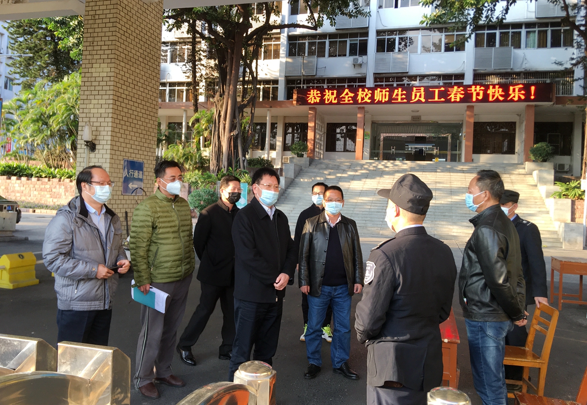 1月28日,学校党委书记凌靖波,副书记李向明,副校长黄秋文、苏晖,到学校东校区检查和督导学校疫情防控工作。