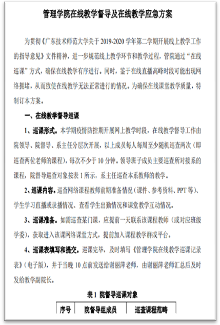 第三阶段,方案实施。制定颁布《管院进一步做好毕业实习工作的通知》《管理学院在线教学督导及在线教学应急方案》,制作《管理学院在线教学巡课记录表》,对确有困难学生进行针对性帮扶与“一人一策”。校、院、系、学委协作,确保在线教学工作落实。