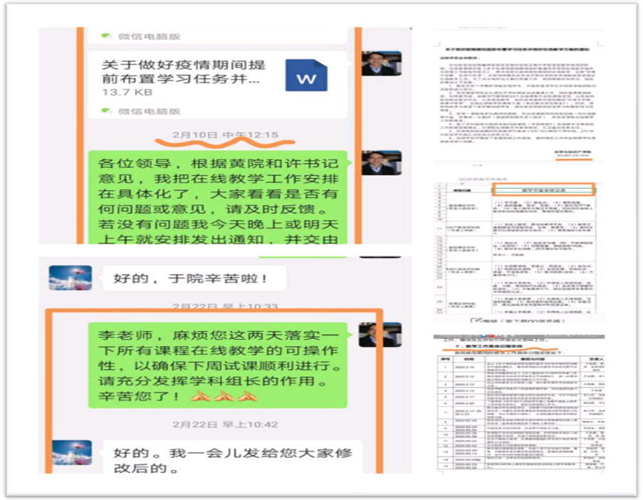 二、高度重视,高效协同。领导班子成员迅速成立线上教学领导小组和工作小组,书记、院长及时审阅工作方案,指导线上教学总体工作,高效协同开展,为工作开展提供保障。