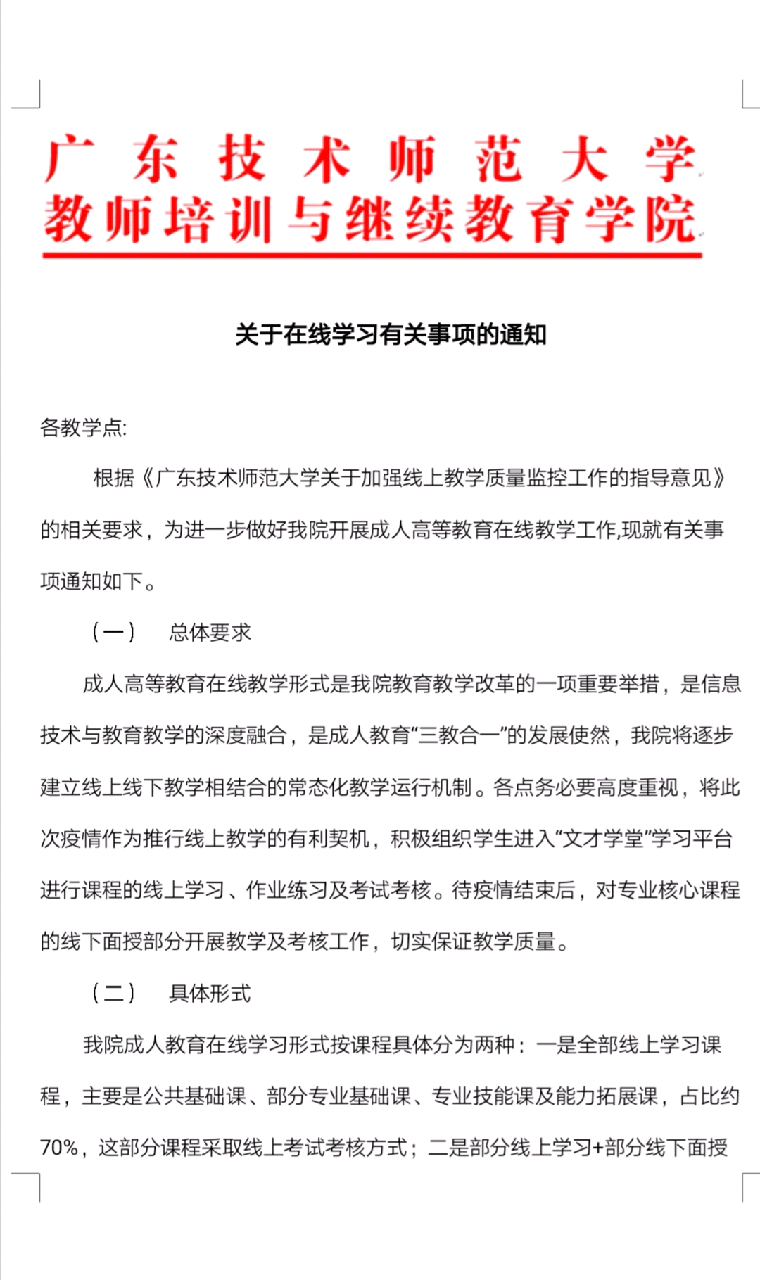 一是加强研究部署,做好春季成人教育开学工作。根据学校《关于做好2020年春季学期开学工作的通知》,学院积极响应,召开班子会议,研究部署对成人教育校外班开展线上教学的相关工作,决定正式启用“成人教育在线学习平台——文才学堂”,发布《关于做好疫情防控工作开展线上教学有关事项的通知》,对校外教学点及成教学生提出“停课不停学”的要求,同时通过建立QQ工作群,对教学点工作人员进行在线培训,制作《线上学习平台学生操作手册》,指导学生正确使用在线学习平台,督促学生加强自我学习、自我管理。