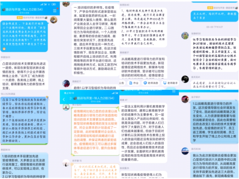 疫情突发倒逼着教学方式的变革,在线学习成为保证学生学习进度的重要方式。围绕在线教学“如何教怎么学”这一主题,人力资源教学团队对主流在线学习平台,包括QQ、微信、企业微信、智慧树、雨课堂、学习通、蓝墨云等进行了对比分析,并对学生进行了问卷调查,本着“保证教学质量、方便师生、不落下一个学生”的原则,最终选定了“EV录屏+QQ群主题讨论+在线答疑”的教学方式,其好处是网络条件要求低,师生软件操作方便,在线卡顿少,覆盖学生范围广,学生不用来回切换APP,更容易集中注意力听讲,保证教学质量,同时辅以师生共同参与设计的主题讨论,更容易激发学生的学习主动性和参与性。