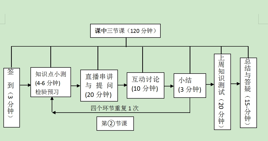 正式上课前,我支部给我院大一大二学生在线直播了第二课堂——额温枪设计,通过三次课的直播调查情况来看:大部分学生反馈直播时间超过35分钟就开始走神,注意力不集中,学习效果打折扣。另外,结合第一周在线课程结束后不同班级问卷反馈结果来看,绝大部分学生仍然希望有一定时间的直播。所以,综合来看,在线课堂设计形式一定需要多样化,以便更好调动学生积极性和参与度,本课程每周一次三学时,其课程环节及时间分配如下图。