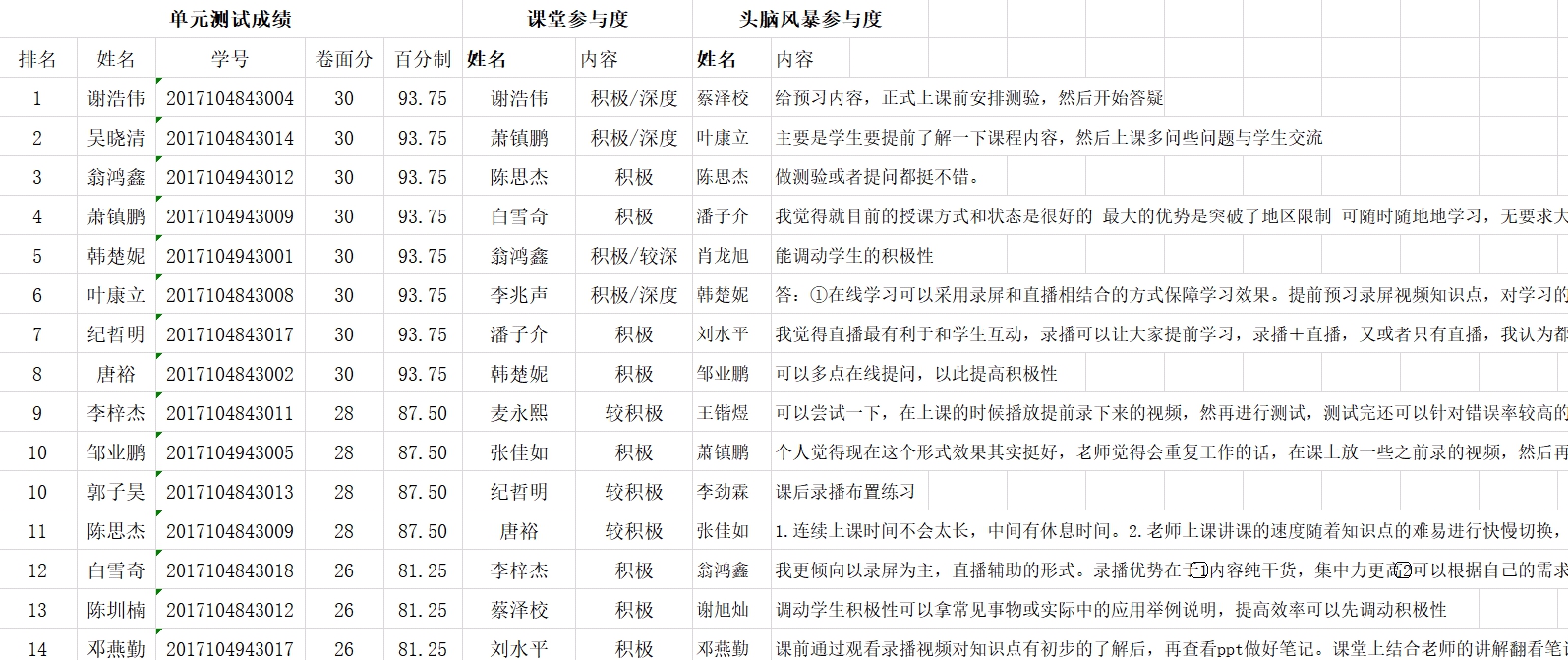 课后将平台记录的学习数据及时导出并做较全面的分析,通过课前资源自学情况、签到情况、课前小测成绩、课堂回答问题参与度、单元测成绩等多维度了解学生学习情况,并对前15名学生公开表扬、对末尾5名学生发私信督促与预警。