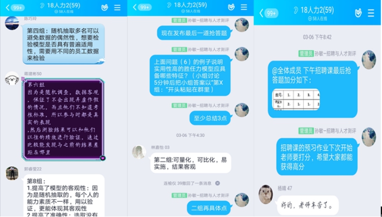 本课程通过基本知识点讲解、小组主题讨论、企业招聘案例分析与模拟项目实操等多样化教学方法来深化学生对招聘与人才测评相关理论与方法的理解与掌握,同时提升学生的沟通交流能力、团队合作能力与专业实践能力。本学期有人力专业18级2个班共计98名学生参与本课程的学习。