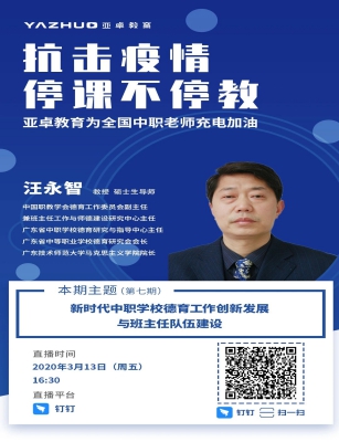 随着教育部“停课不停学”要求在全国各地的贯彻实施,很多平台、很多教育机构都开展了公益性的空中服务课堂,特别是应广大青少年学生不满足于只看只听现有录制好的课程、喜欢看直播的愿望,汪永智教授应邀于2020年3月13日下午4:30分开始在钉钉直播平台“亚卓大课堂”上了一个半小时的直播课。本活动由北京师范大学公民与道德教育研究中心、广东省中等职业学校德育研究会与亚卓教育共同举办,他以《新时代中职学校德育工作创新发展与班主任队伍建设》为题进行专题讲授。为了保证教学效果,他理清思路、沉着应战,在没有讲稿的情况下,全神投入、激情奉献,中间没有休息没喝一口水,一气呵成,受到听众的热烈欢迎和称赞。开播前半小时数千教师涌入直播群,钉钉直播平台只好临时又新开了4个直播群满足大家的需要,近2小时的直播中注册观看教师人数达到了6239人,参加听课的教师覆盖了全国18个省份的数百所中等职业学校,获互动消息2000余条,有45135次点赞。全国中职学校班主任基本功大赛一等奖获得者、广州市医药职业技术学校谢建玲老师听课后激动地说:“每次听汪教授讲课都会热血沸腾,汪教授传达新思想娓娓道来又振奋人心,真的很佩服汪教授把高大上的理论讲的这么接地气”。还有很多学校教师和伟德国际1949始于英国的研究生、本科生通过电视投屏全家观看,有的学校组织全体教师集体或居家收看收听。如广东清远市职校组织了全校老师上线观看听讲,内蒙古自治区呼伦贝尔市莫旗职业教育中心组织全体校委会、环节干部、班主任、任课教师准时守候在电脑前收看专题讲座,江苏省建湖中专全体中层干部和班主任准时进入钉钉直播平台,参加全国“新时代中职学校德育工作创新发展与班主任队伍建设”在线培训。