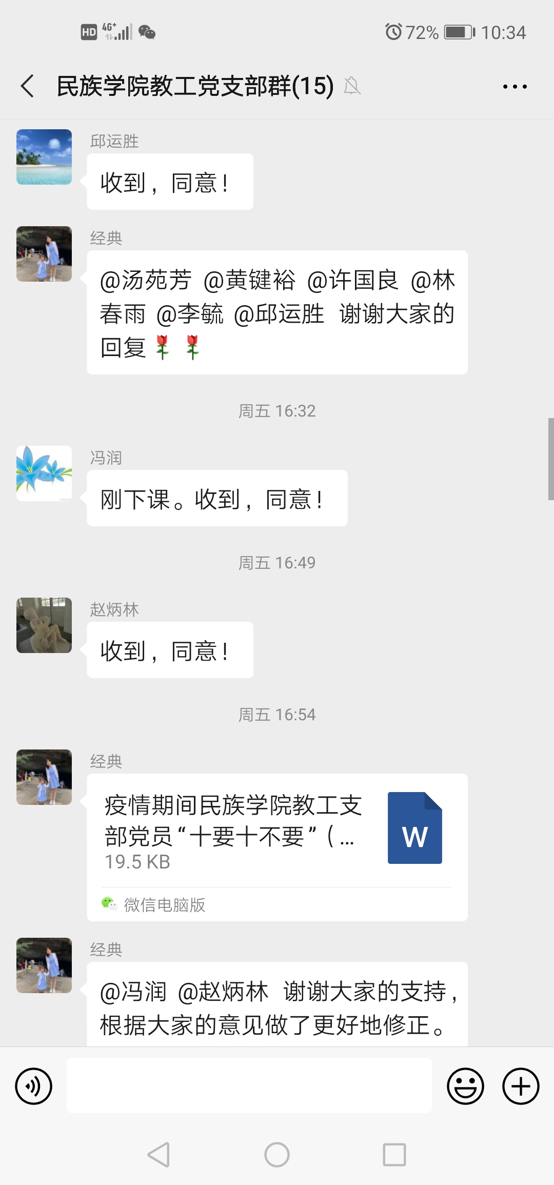 “我是共产党员,我一定要去!”汽车与交通工程学院教工党员孔春玉老师,目前仍在湖北老家,她通过视频和大家分享自己在湖北抗“疫”一线的所见所闻,其中讲到了一位年近七旬、在武汉做保洁员的老人家,面临用工人员短缺,家人劝解不要再去工作的情景时,老人家义正言辞地说到“我是共产党员,我一定要去!”保洁员的故事令许多老师潸然泪下。