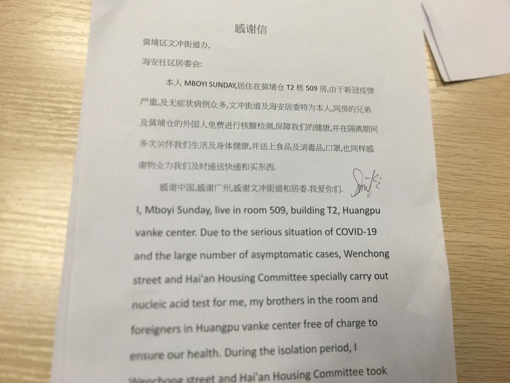 本人MBOYI SUNDAY,居住在黄埔仓T2栋509房,由于新冠疫情严重,及无症状病例众多,文冲街道及海安居委特为本人、同房的兄弟及黄埔仓的外国人免费进行核酸检测,保障我们的健康,并在隔离期间多次关怀我们生活及身体健康,并送上食品及消毒品、口罩,也同样感谢物业为我们及时递送快递和买东西。