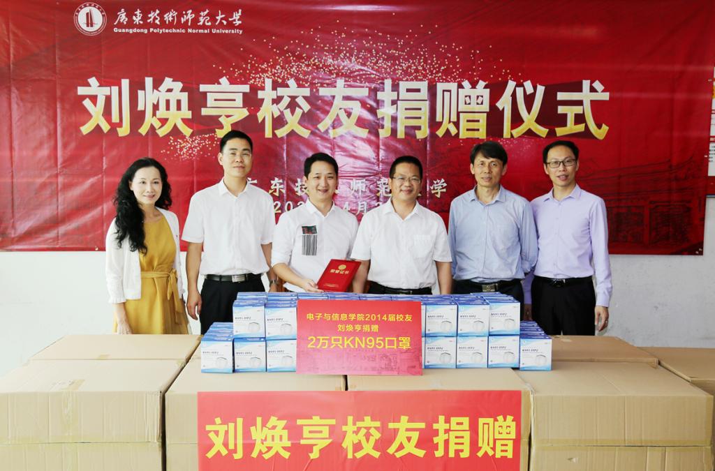4月21日,电子与信息学院2014届校友刘焕亨为母校捐赠2万只KN95口罩(价值约20万)用于疫情防控。捐赠仪式在电子与信息学院会议室举行,校党委副书记李向明及相关负责人参加了捐赠仪式。