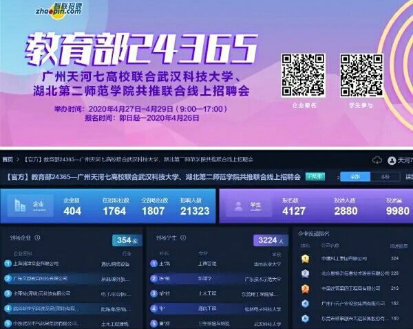 此外,伟德官网还积极响应教育部号召,参加了教育部24365—广州天河七高校联合武汉科技大学、湖北第二师范学院共推联合线上招聘会。截至4月29日活动结束,共吸引到全国各地共计404家企业参会,共提供岗位1807个,总招聘需求达21323人,共吸引到3224名来自全国各地的毕业生报名参会。其中,伟德官网毕业生报名参会比例达总报名人数12%。