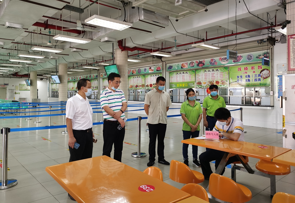 督查组分成四组实地考察了校门口、食堂、宿舍、医务室、隔离室等重要场所及有关档案资料,从学校组织领导、重点人员管理、校园管理与环境整治、防控物资储备、宣传教育等方面,全面检查了白云校区师生返校各项准备工作情况。