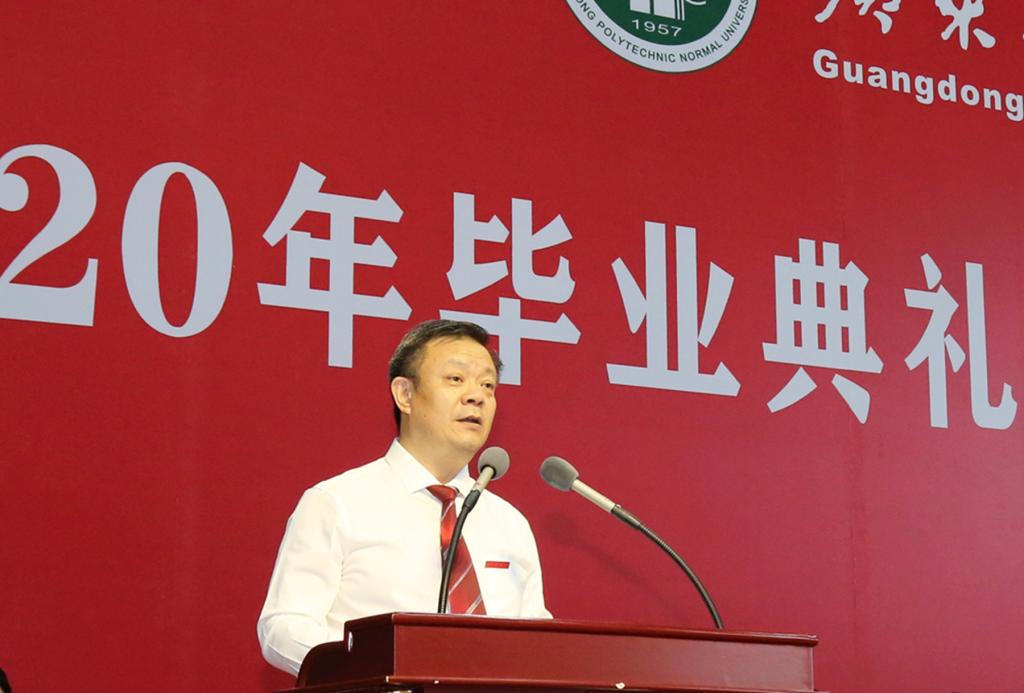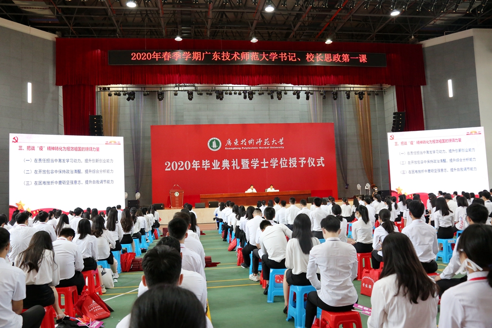 根据《广东省教育厅关于做好2020年春季学期高校党委书记、校长和院(系)党组织书记、院长(系主任)上第一堂思想政治理论课工作的通知》要求,6月23日,学校党委书记凌靖波、校长骆少明在白云校区学生活动中心讲授2020年春季学期思政第一课。党委办公室、校长办公室、党委宣传部、学生工作部、团委、部分学院负责人及2020届毕业学生代表300余人现场聆听讲课。