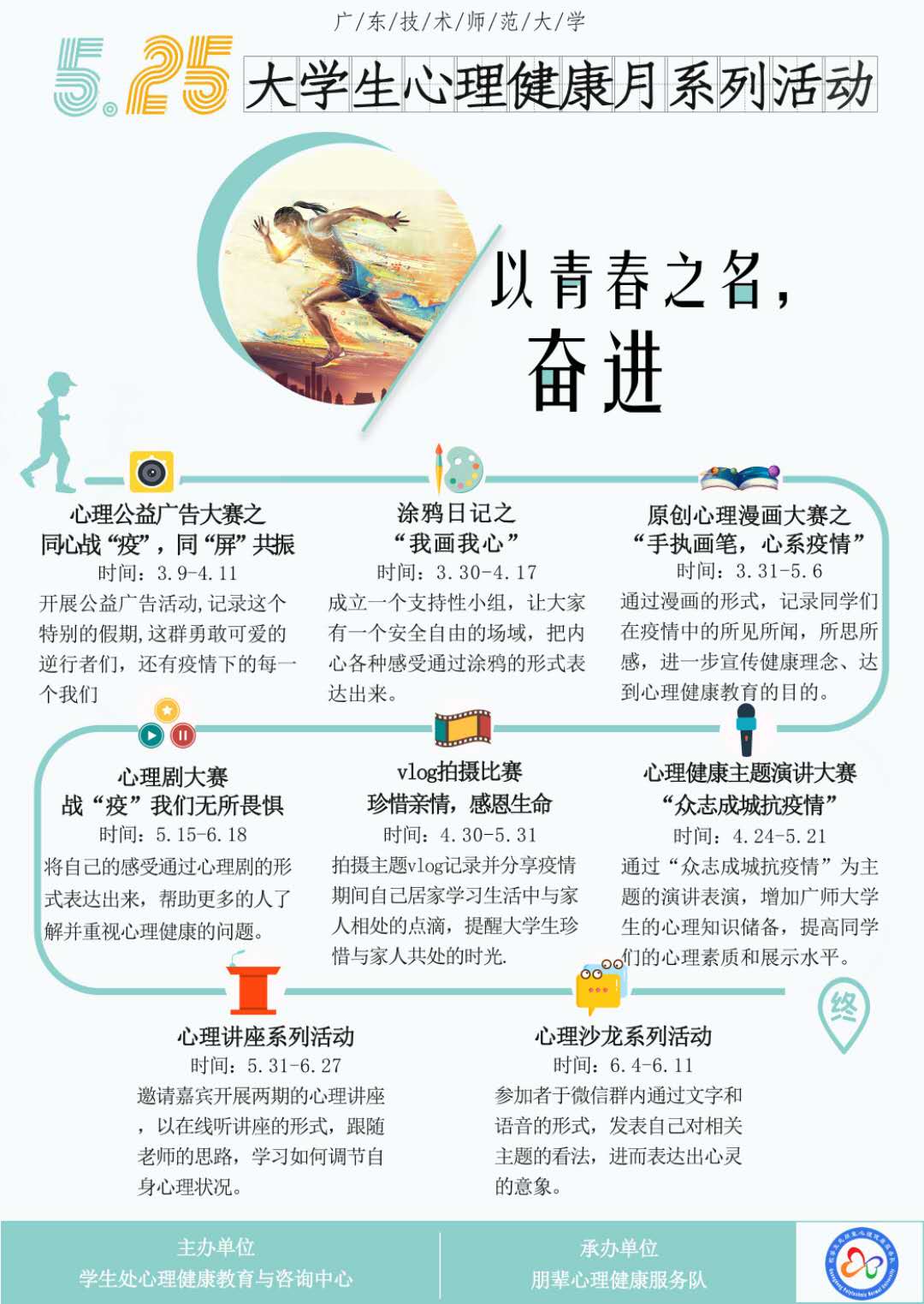 本次心理健康教育活动月从三月中旬拉开帷幕,“以青春之名,奋进!”为主题,密切围绕抗击疫情内容展开。活动形式丰富、创意满满:有邀请广东省人民医院副主任医师刘向欣主讲《心理健康谁做主--疫情下大学生心理健康》、暨南大学张将星主任主讲《居家期间如何做好自我照料》等专题讲座;有帮助同学们进行自我放松、调节情绪、考试焦虑的系列自我安抚技术、涂鸦日记、心理沙龙等精彩活动;更有师生们喜闻乐见的各式比赛:“同心战‘疫’,同‘屏’共振”心理公益广告大赛、“手执画笔,心系疫情”原创心理漫画大赛、“众志成城抗疫情”心理健康主题演讲大赛、“珍惜亲情,感恩生命”vlog拍摄比赛、“战‘疫’我们无所畏惧”心理剧大赛等,得到了广大师生的大力支持和广泛参与。