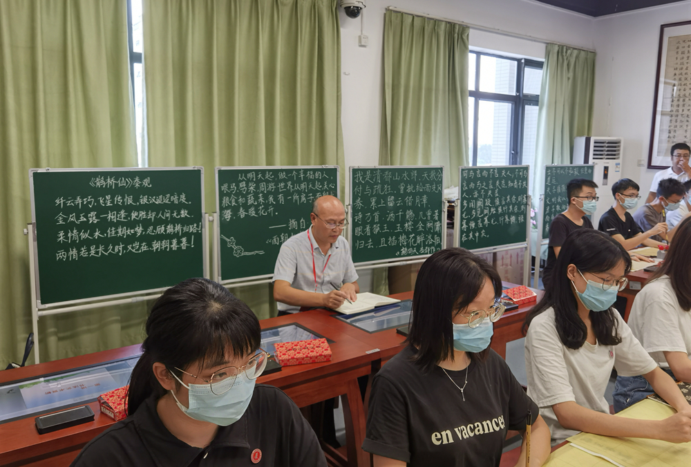 图为认证专家组成员王景魁(高级职称)认真观摩财务会计教育的《书法》(三笔字训练)课程授课情况