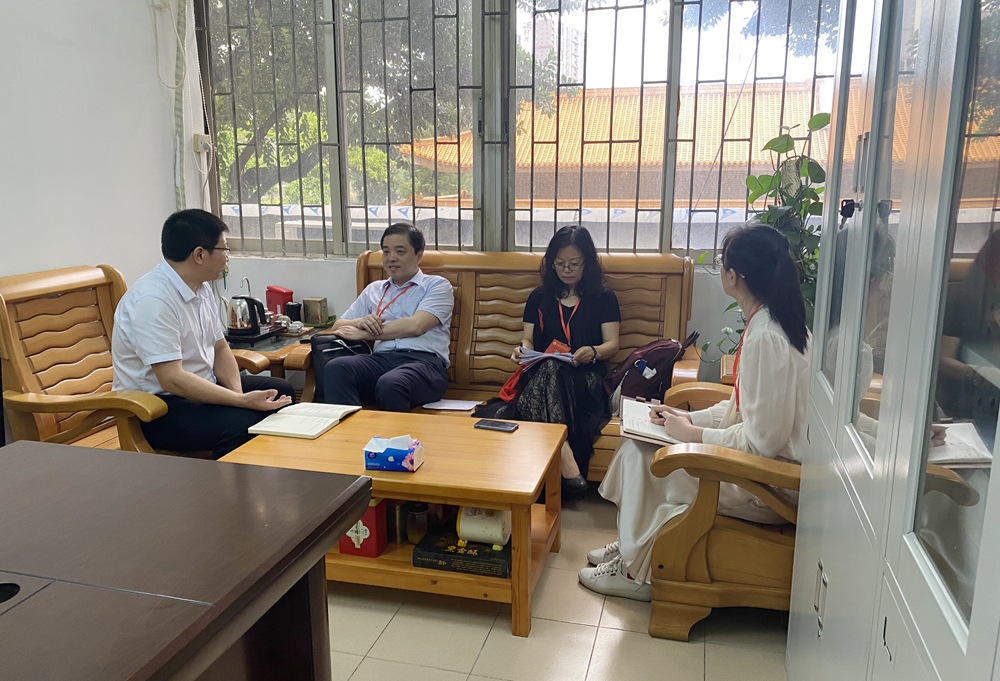 图为认证专家组成员潘镇教授、项目组管理员周晓静副教授与伟德官网教务处处长向凯进行访谈