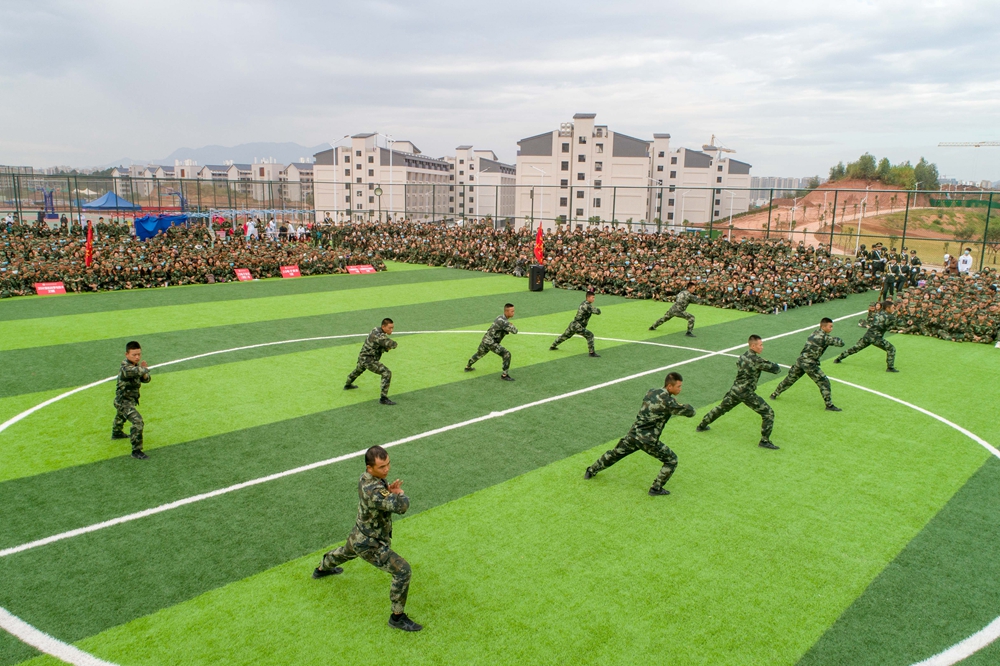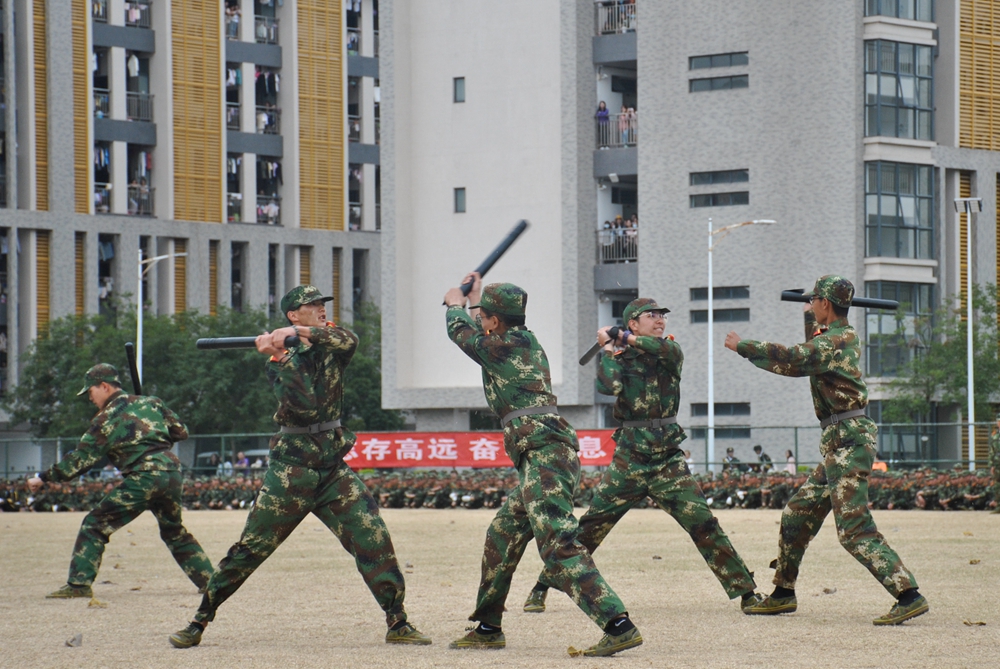 分列式阅兵、应急棍术方阵、战术方阵、匕首操方阵、刺杀方阵、警棍术方阵、军体拳方阵、心理健康操方阵先后进行了队列、棍术、匕首操、警棍术、擒敌格斗等表演,一拳一腿,动作整齐划一,刚毅潇洒;一声声口号,铿锵有力,气势磅礴,充分展示了受训新生良好的精神风貌。