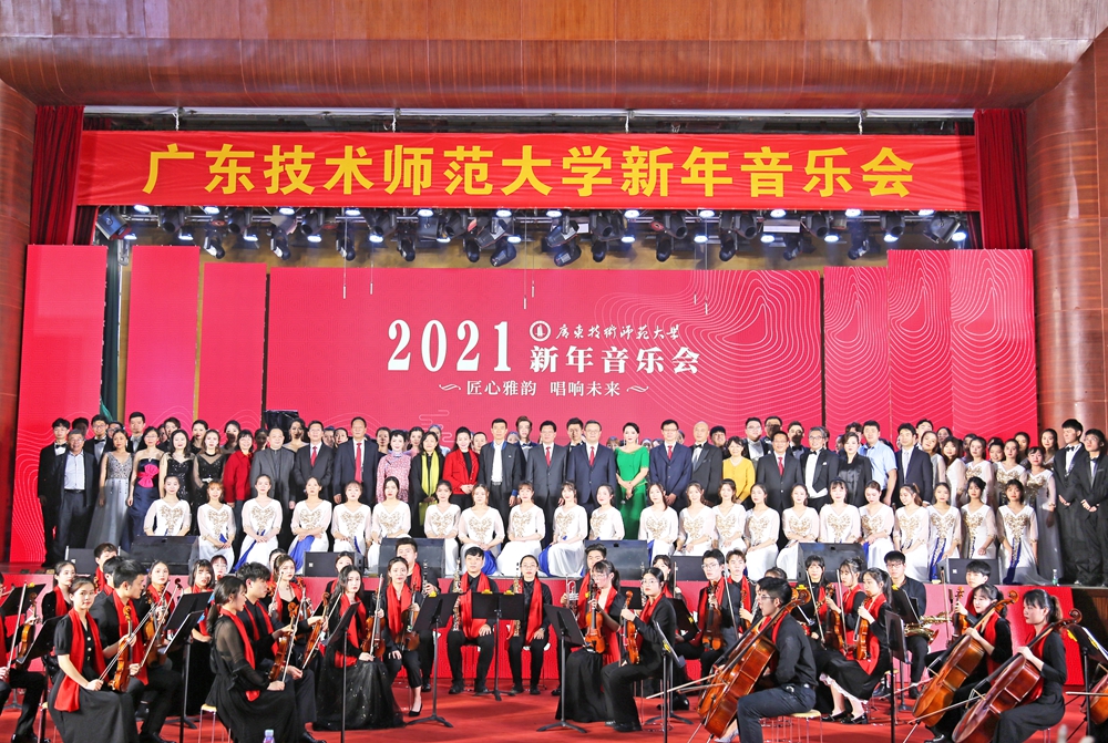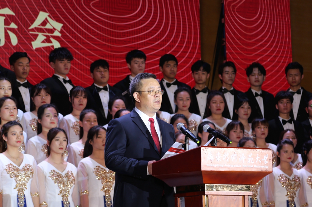 音乐会伊始,学校校长骆少明向全校师生致辞。他表示,回顾2020年,学校教育事业呈现出前所未有的美好前景和蓬勃向上的发展势头。主要体现在:疫情防控取得胜利确保了校园安全稳定、学校招生规模首次突破万人大关、学校学科专业建设上新台阶、高层次人才引进取得历史性突破、教学实训实验室建设步伐加快办学条件改善、学校办学社会声誉进一步提高。这些成绩的取得与各级党委、政府和社会各界关心支持分不开,也是广大师生员工团结拼搏的结果。2021年是学校“十四五”的开局之年,我们将迎来建党100周年和国家开启第二个百年奋斗目标的新征程。在这承上启下、继往开来的历史时刻,我们将继续高举习近平新时代中国特色社会主义思想伟大旗帜,始终坚持社会主义办学方向,“不忘立德树人初心,牢记为党育人、为国育才使命”,聚焦打造建设中国特色世界水平技术师范大学奋斗目标,持续深化内涵建设,加快推进学校既定目标的任务落实,为学校做大做强换挡提速,用智慧与激情开创学校事业发展的新篇章。