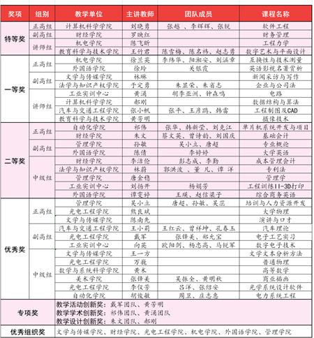 经过激烈角逐,计算机科学学院刘晓勇教授团队、财经学院罗映红副教授、机电学院陈飞昕老师和教育科学与技术学院王竹君老师团队分获正高组、副高组、中级组特等奖;徐兰英教授团队和徐玲教授团队,林琳副教授和于定勇副教授团队,黄涌老师团队、郝刚老师、张小帆老师团队和黄芳明老师,分获正高组、副高组、中级组的一等奖。祁伟教授团队、黄涌老师团队获“教学学术创新奖”,朱文教授团队、郝刚老师获“教学设计创新奖”,戴军老师团队、黄芳明老师获“教学活动创新奖”。文学与传媒学院、财经学院、光电工程学院、机电学院、外国语学院、管理学院等获“优秀组织奖”。