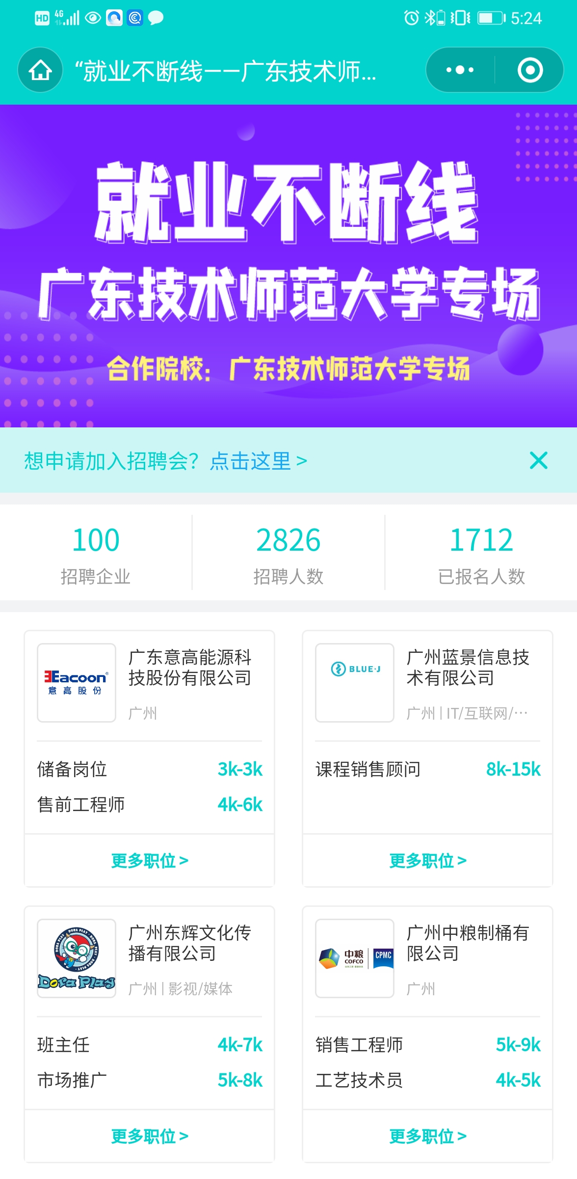 2月20日-3月1日,伟德官网联合共青团广东省委员会、兼职猫云校招平台举办了“就业不断线”2021届春招线上校园双选会伟德国际1949始于英国专场,吸引了包括中粮集团、广汽集团、中铁六局集团等100多家企业报名参加,向毕业生提供了282个来自于高新科技、快消商品、教育、文化传媒等不同类别行业的优质岗位,岗位需求数达2826人,网络视频招聘会访问人数达3070人次,共投出简历565份。