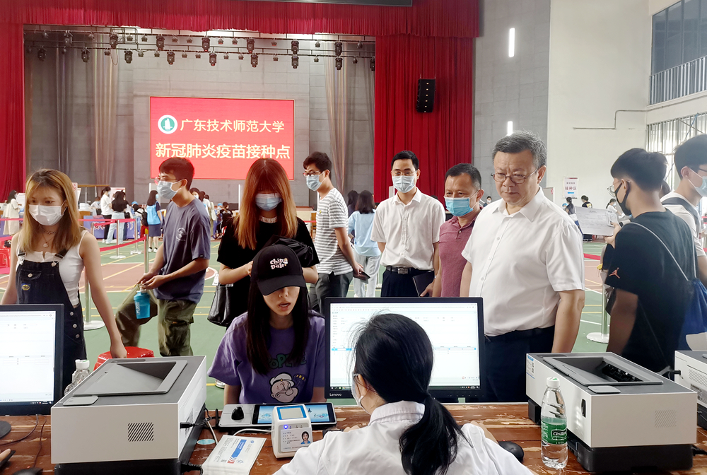 在白云校区学生活动中心疫苗接种现场,骆少明实地察看了疫苗接种登记区、接种区、留观区、应急处置区等场所设置,详细询问了接种流程、技术规范、人员配备、急救设备等保障情况,认真查看了各环节运行情况。骆少明对现场接种学生积极响应国家号召表示赞赏,就医务人员、学生志愿者、工作人员的辛苦付出表示慰问和衷心感谢,要求各部门通力配合,精心组织,做好师生疫苗接种工作,共同构筑起校园免疫屏障。