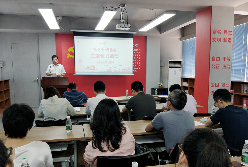 为进一步继承和弘扬党的保密工作优良传统,推进学校党史学习教育走深走实,5月8日,党办与统战部党支部、网络空间安全学院直属党支部的教师党员共20余人在东校区图书馆6楼初心斋党员活动室共同开展“学党史•保秘密”主题党日活动。学校党委书记凌靖波以普通党员身份参加了活动。