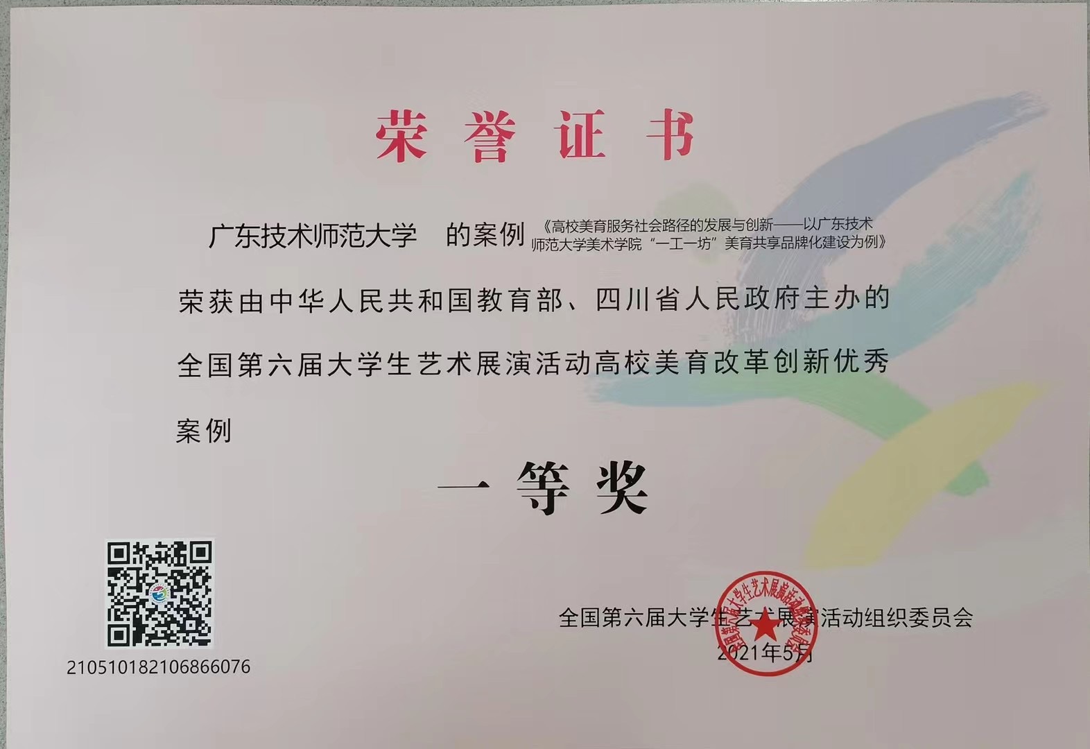 其中,学校副校长黄秋文的摄影作品《溪水、原野与伙伴》(组照)是广东省选送参加高校校长摄影类的唯一参展作品,荣获高校校长书画摄影作品“校长风采奖”;美术学院选送的《高校美育服务社会路径的发展与创新——以伟德国际1949始于英国美术学院“一工一坊”美育共享品牌化建设为例》荣获全国高校美育改革创新优秀案例一等奖,《粤绣非遗工作坊》荣获艺术实践工作坊二等奖;校学生艺术团合唱作品《彩虹》、《山楂树》荣获声乐类甲组二等奖;美术学院学生王瑜的作品《悬空的仙人掌》荣获艺术作品(绘画)甲组三等奖。这是伟德官网在全国大学生艺术展演舞台上获得的历史最好成绩,实现了一等奖零的突破和获奖总数之最。