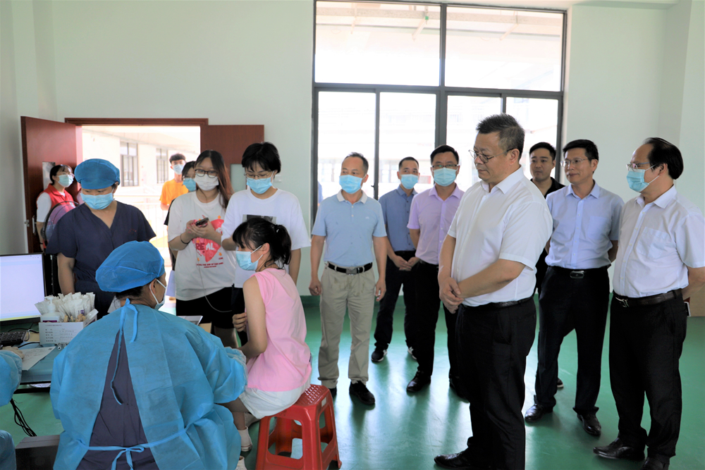 骆少明一行先来到河源校区学生活动中心二楼新冠疫苗接种现场视察,听取了校区管委会、河源市防疫部门负责同志对校区师生疫苗接种工作进展的汇报,查看了接种现场各区域情况,向奋战在疫苗接种一线的工作人员、志愿者表示慰问和感谢,并看望和鼓励了现场接种的师生。