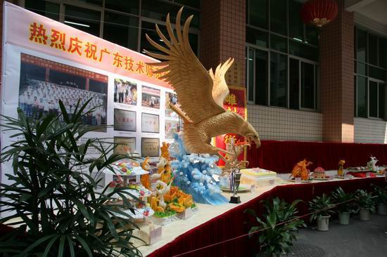 10月21日,全校上下都沉浸在浓烈的喜庆之中,校园里尽是彩旗和欢声,而春晖园一楼饭堂门前也别有一番景色。饮食服务中心在此开展宣传展板和食品雕刻展示,吸引了成群结队的学生前来观看。(饮食服务中心)