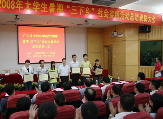 11月4日下午,伟德官网2008年暑期“三下乡”社会实践总结表彰大会在第一教学楼讲学厅隆重举行。校党委书记邝邦洪、校长王乐夫、党委副书记罗海鸥出席大会,各有关部门负责人及参加社会实践活动的师生等250多人参加了表彰大会。校党委书记邝邦洪、校长王乐夫、党委副书记罗海鸥分别为研究生赴信宜市职业技术学校团队等6支优秀团队,刘楚玲、雷顺明等50名社会实践积极分子学生代表颁奖并合影留念。