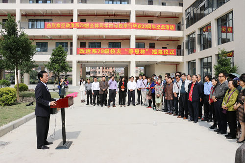 林志坚校友代表政治系79级全班同学,感谢学院领导、老师以及学弟学妹们对他们回母校举行毕业30周年纪念活动的关心支持,特别是对捐赠“感恩林”的大力支持。他深情地回忆了30多年前在校时的难忘时光,为母校发生的沧桑巨变倍受鼓舞、深感骄傲。并赋诗“三十年来思报恩,万余昼夜梦成真。校园新貌情无限,百树芳菲满院春”以表达校友们感恩的心和对母校的良好祝愿。