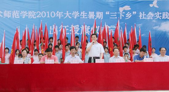 7月10日,由学院团委组织的广东技术师范学院2010年大学生暑期“三下乡”社会实践活动授旗仪式在校本部新篮球场举行。学院党委书记邝邦洪、院长王乐夫、党委副书记詹步强以及党委组织部、学生工作部(处)、教务处、研究生处、社会科学部、团委等部门负责人,各二级学院主管学生工作的党委(总支)书记(副书记)出席仪式。团委干部、各团总支书记、团队指导老师以及来自各个校区参加今年暑期社会实践活动的700余名学生参加了仪式。仪式由团委负责同志主持。
