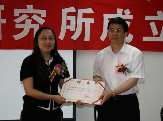 图为校党委书记邝邦洪为研究所名誉所长、全国首届大学生职业规划设计大赛专家组组长、北京师范大学侯志瑾博士颁发聘书。