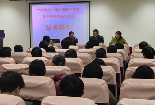2月27日,广东省第二期中等职业学校“多媒体CAI课件/软件制作”、“职业教育管理”骨干教师省级培训班在工业实训中心八楼讲学厅举行结业典礼。省教育厅教师继续教育指导中心主任吴琦琳、学院副院长张茂光及师资培训中心负责人等出席了结业典礼。