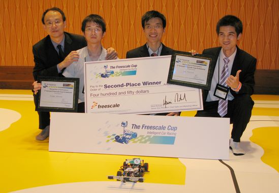 在“飞思卡尔”智能车比赛中,摄像头与光电比起电磁智能车有着得天独厚的优势,其传感器前瞻距离远,特别是摄像头,其速度能够很轻松地秒杀其他两种类别的智能车。在国内历年的飞思卡尔智能车大赛中,由于传感器所具有的前瞻性不同,摄像头组速度最快,光电组居中,磁导航速度最慢。而此次美国邀请赛不分组别,磁导航组、光电组和摄像头组一起竞速,实际上作为磁导航冠军队的我们在起跑线上已经处于劣势,但是我们的队员和指导教师并没有灰心,大家认真分析,积极调试,沉着应对,在总决赛上凭技术展示了我院代表队的实力,最终取得了第二名的优异成绩,而且比第一名只差不到一秒,为我院争得了荣誉。