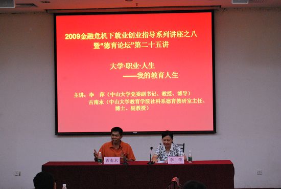 6月23日,“2009金融危机下就业创业指导”系列讲座第八讲暨“德育论坛”第二十五讲在校本部讲学厅举行。中山大学党委副书记、博士生导师李萍教授和中山大学教育学院社科系德育教研室主任、心理教育专家古南永副教授应学校邀请,以“大学•职业•人生——我的教育人生”为题为伟德官网师生作了一场学术报告。校长王乐夫、校党委副书记罗海鸥出席报告会,全体政工干部、社科部教师及学生代表200多人聆听了报告。报告由校党委副书记罗海鸥主持。