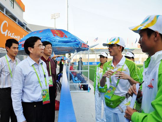 11月10日,学院党委书记邝邦洪、副书记詹步强在学院团委负责同志的陪同下前往亚运会竞赛场馆奥林匹克体育中心曲棍球场,看望慰问我院亚运会志愿者。